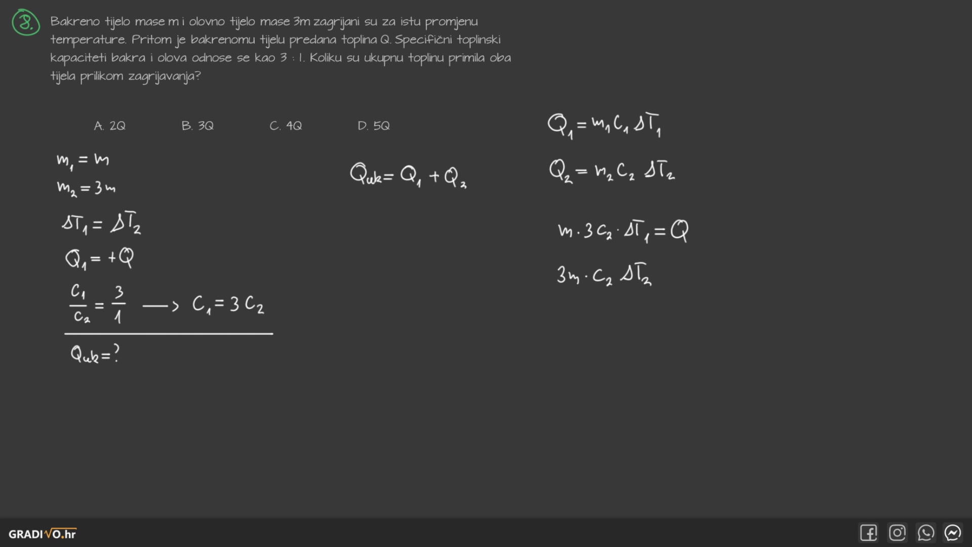 Bakreno tijelo mase $m$ i olovno tijelo mase $3 m$ zagrijani su za istu promjenu temperature. Pritom je bakrenomu tijelu predana toplina $Q$. Specifični toplinski kapaciteti bakra i olova odnose se kao 3 : 1. Koliku su ukupnu toplinu primila oba tijela prilikom zagrijavanja?