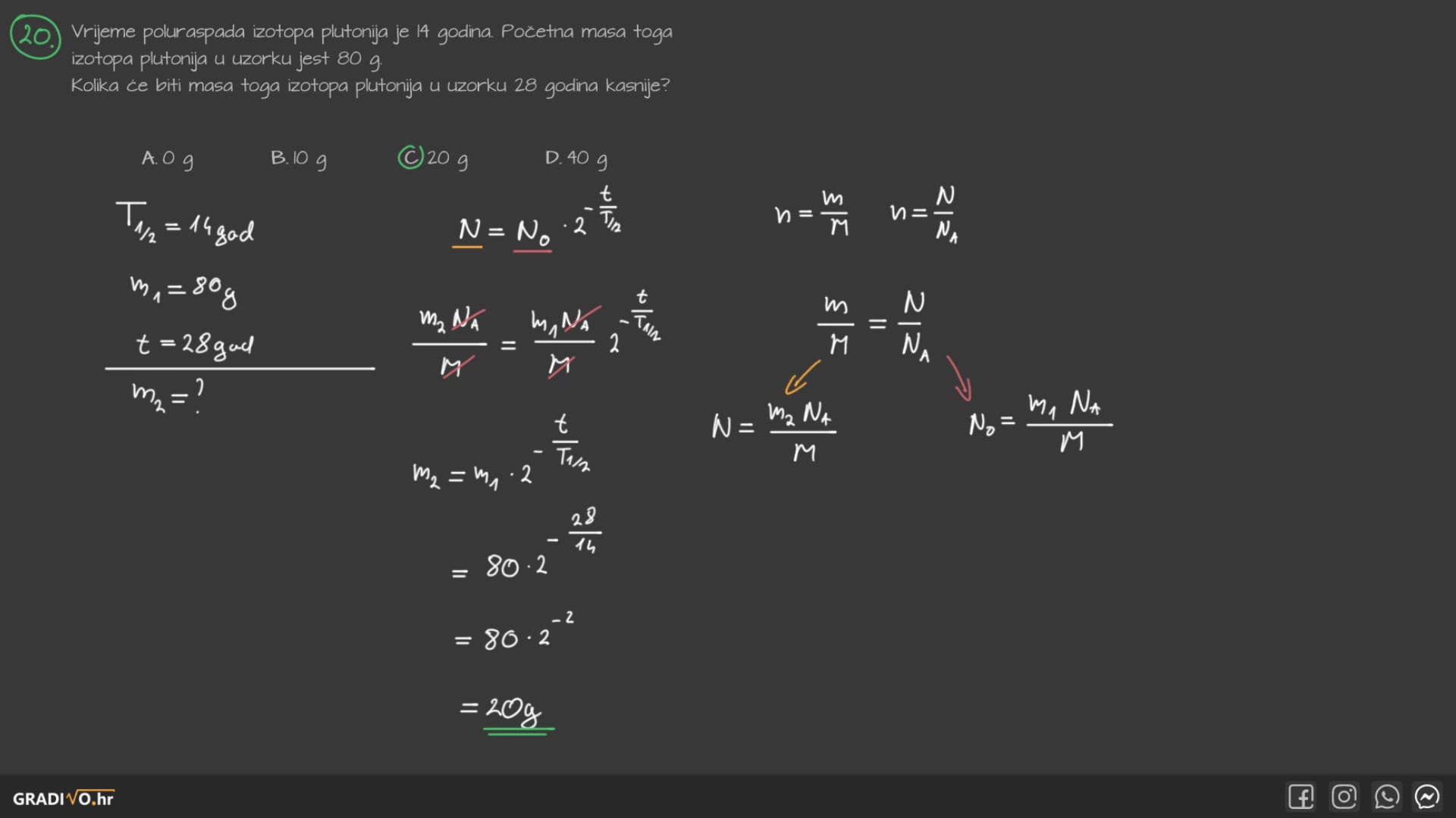 Vrijeme poluraspada izotopa plutonija je 14 godina. Početna masa toga izotopa plutonija u uzorku jest 80 g . Kolika će biti masa toga izotopa plutonija u uzorku 28 godina kasnije?