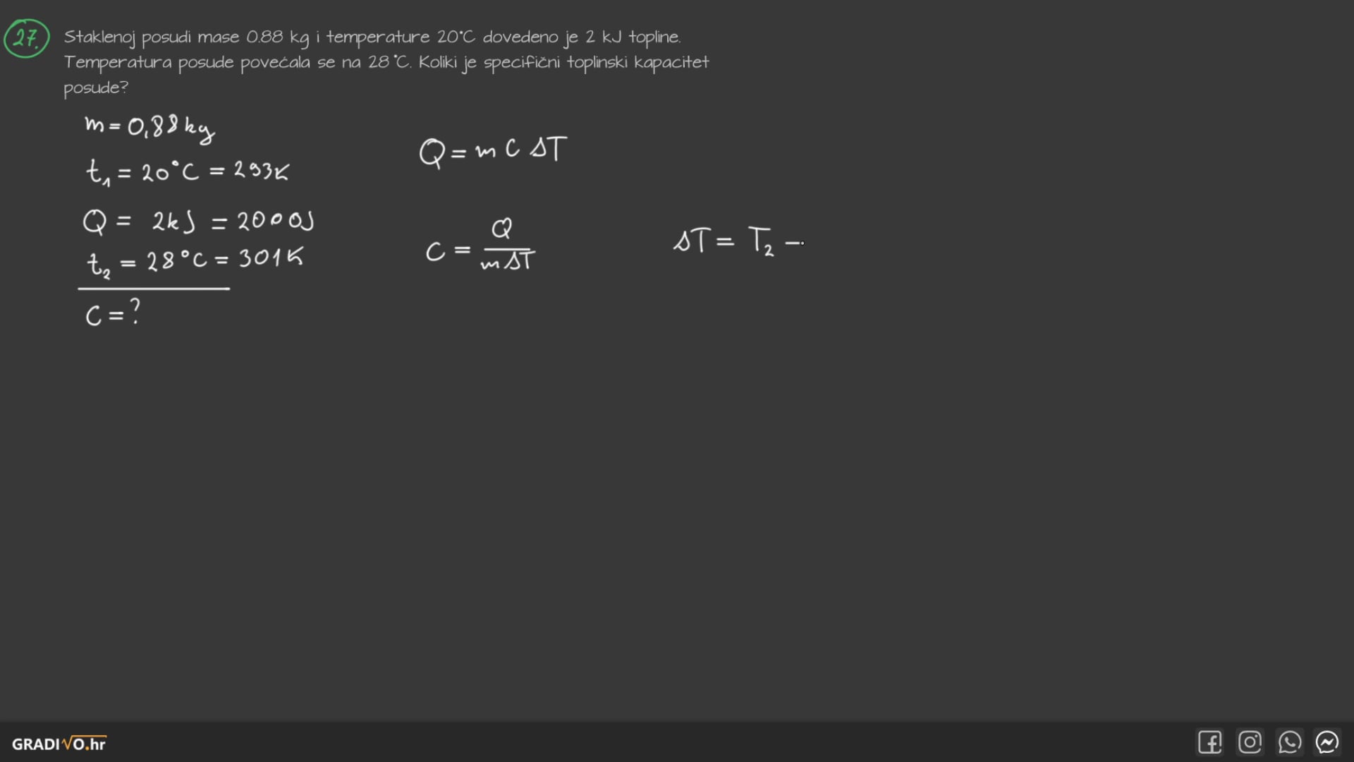 Staklenoj posudi mase 0.88 kg i temperature $20^{\circ} \mathrm{C}$ dovedeno je 2 kJ topline. Temperatura posude povećala se na $28^{\circ} \mathrm{C}$. Koliki je specifični toplinski kapacitet posude?