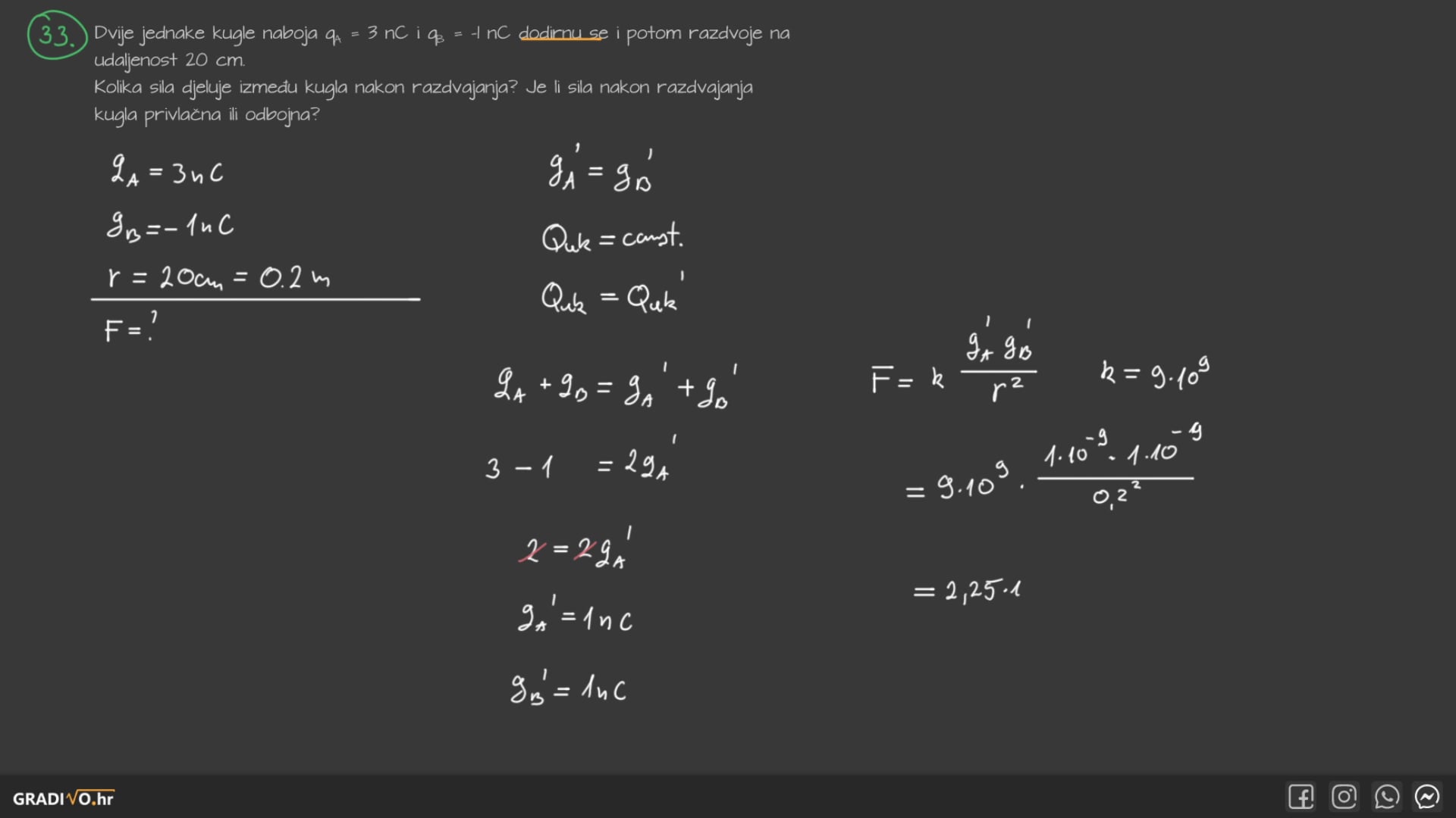 Dvije jednake kugle naboja $q_{\mathrm{A}}=3 \mathrm{nC}$ i $q_{\mathrm{B}}=-1 \mathrm{nC}$ dodirnu se i potom razdvoje na udaljenost 20 cm . Kolika sila djeluje između kugla nakon razdvajanja? Je li sila nakon razdvajanja kugla privlačna ili odbojna?