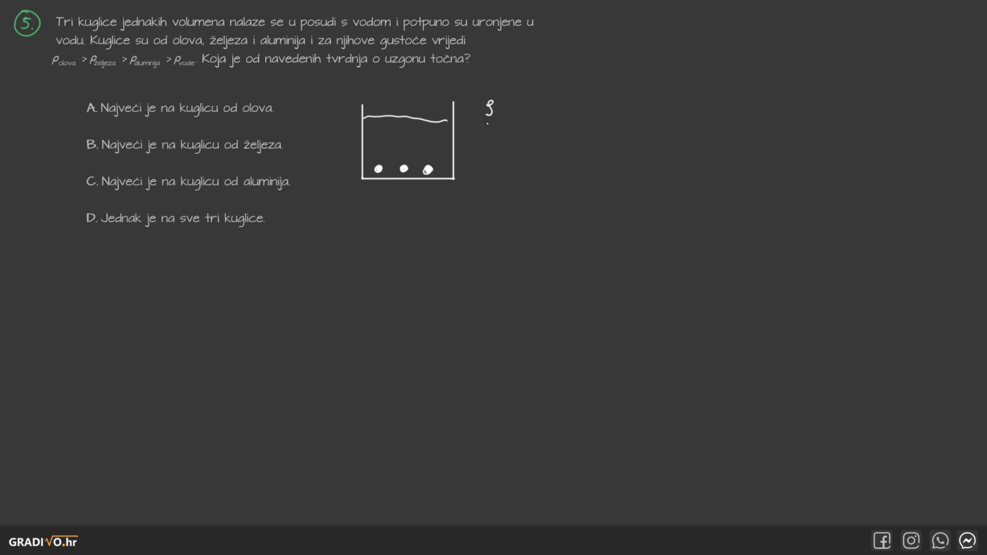 Tri kuglice jednakih volumena nalaze se u posudi s vodom i potpuno su uronjene u vodu. Kuglice su od olova, željeza i aluminija i za njihove gustoće vrijedi $\rho_{\text {olova }}>\rho_{\text {željeza }}>\rho_{\text {aluminija }}>\rho_{\text {vode }}$. Koja je od navedenih tvrdnja o uzgonu točna?