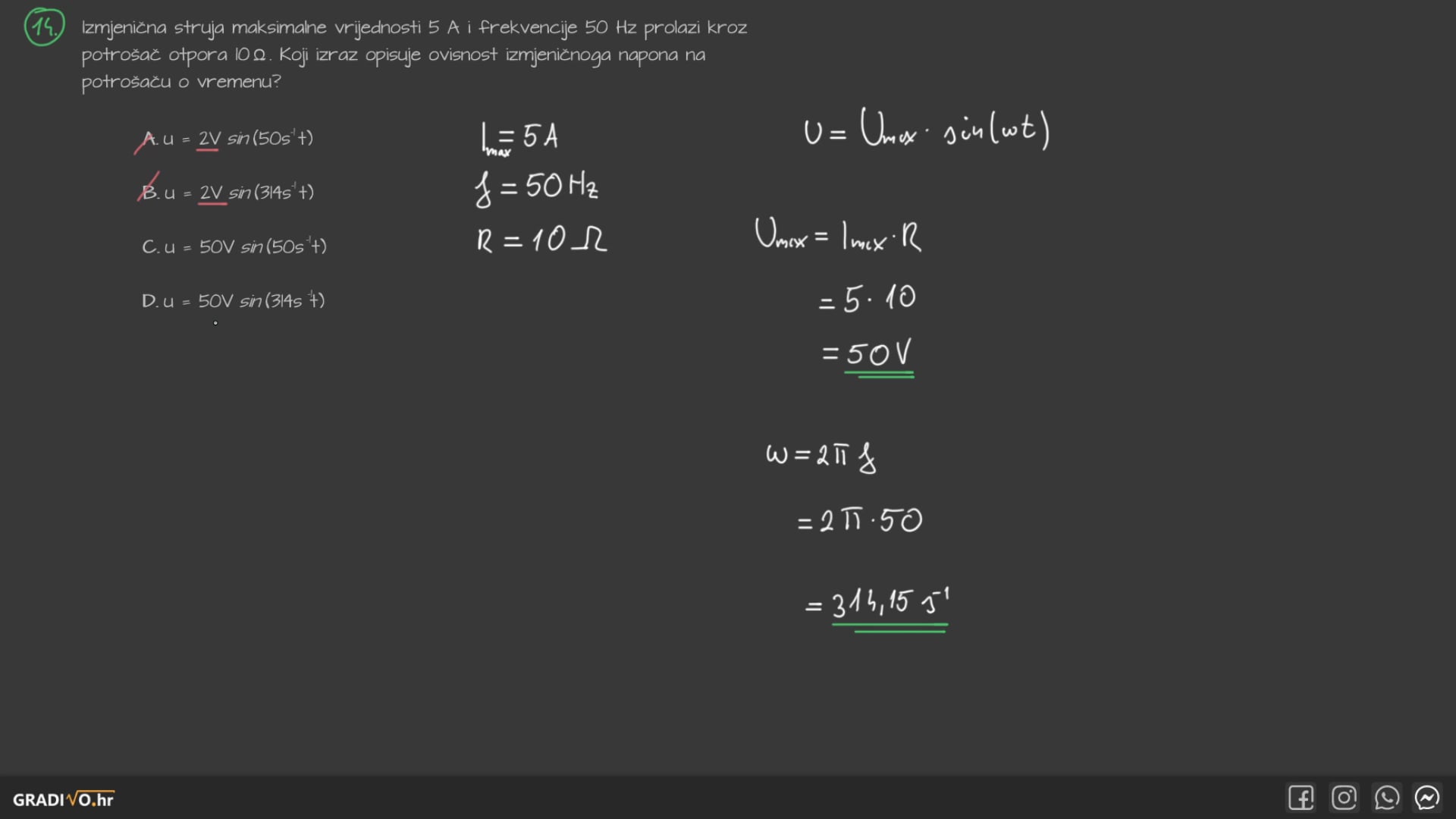 Izmjenična struja maksimalne vrijednosti 5 A i frekvencije 50 Hz prolazi kroz potrošač otpora $10 \Omega$. Koji izraz opisuje ovisnost izmjeničnoga napona na potrošaču o vremenu?