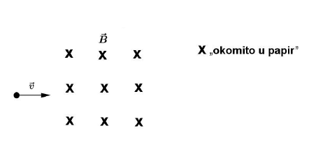 Okomito na silnice homogenoga magnetskog polja uleti $\alpha$-čestica brzinom $5 \cdot 10^{6} \mathrm{~m} / \mathrm{s}$ kao što je prikazano na slici. Kolika mora biti jakost toga magnetskog polja da se $\alpha$-čestica nastavi gibati po kružnici polumjera 10 cm ?