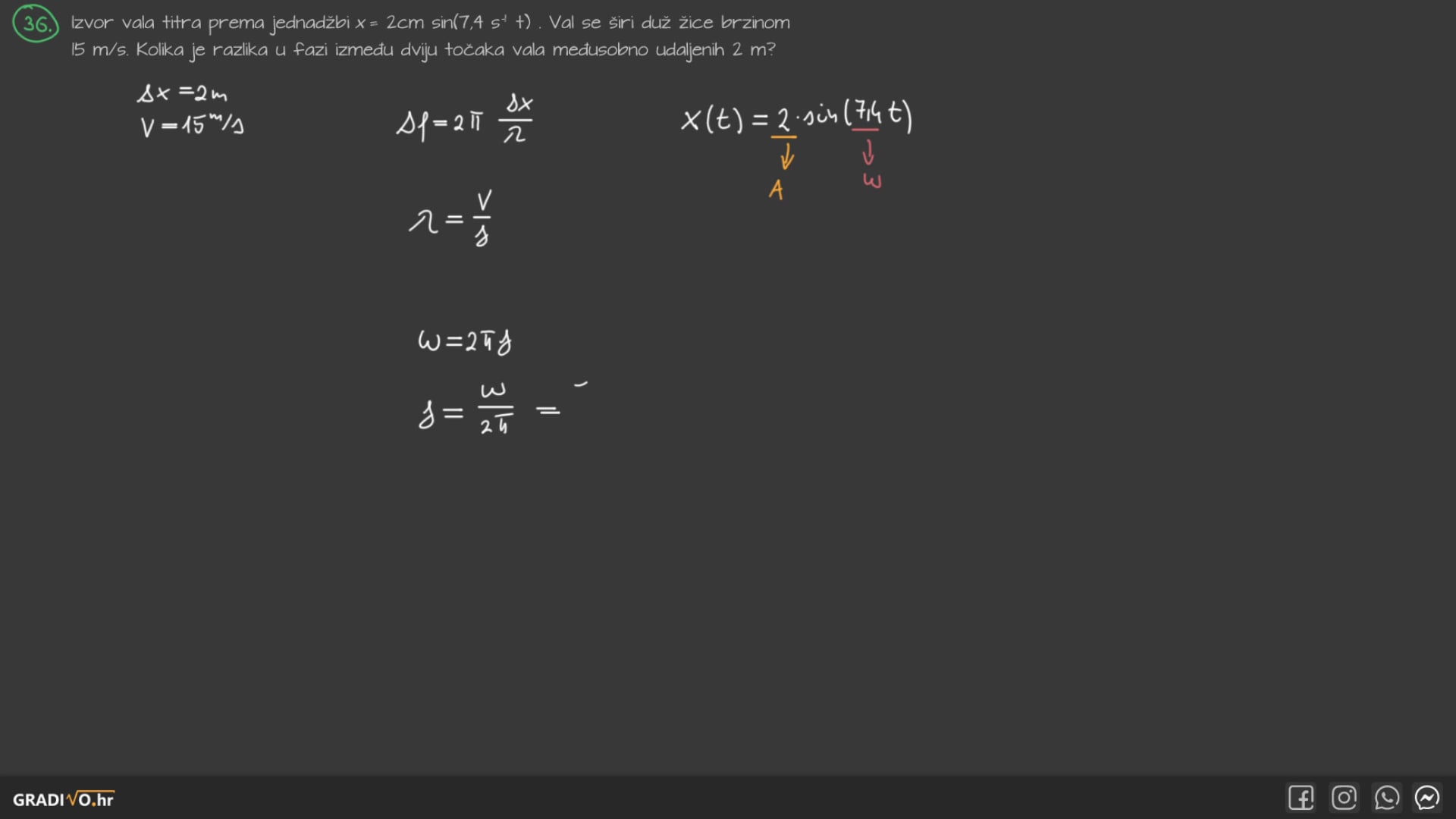 Izvor vala titra prema jednadžbi $x=2 \mathrm{~cm} \sin \left(7,4 s^{-1} t\right)$. Val se širi duž žice brzinom $15 \mathrm{~m} /\mathrm{s}$. Kolika je razlika u fazi između dviju točaka vala međusobno udaljenih 2 m ?