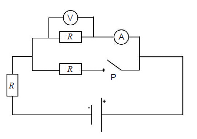Na slici je prikazana shema strujnoga kruga s trima otpornicima jednakih otpora R i izvorom istosmjerne struje. Ampermetar A i voltmetar V mjere struju i napon prije uključivanja prekidača P. Kakve će vrijednosti struje i napona mjeriti ampermetar i voltmetar kada se prekidač P uključi?