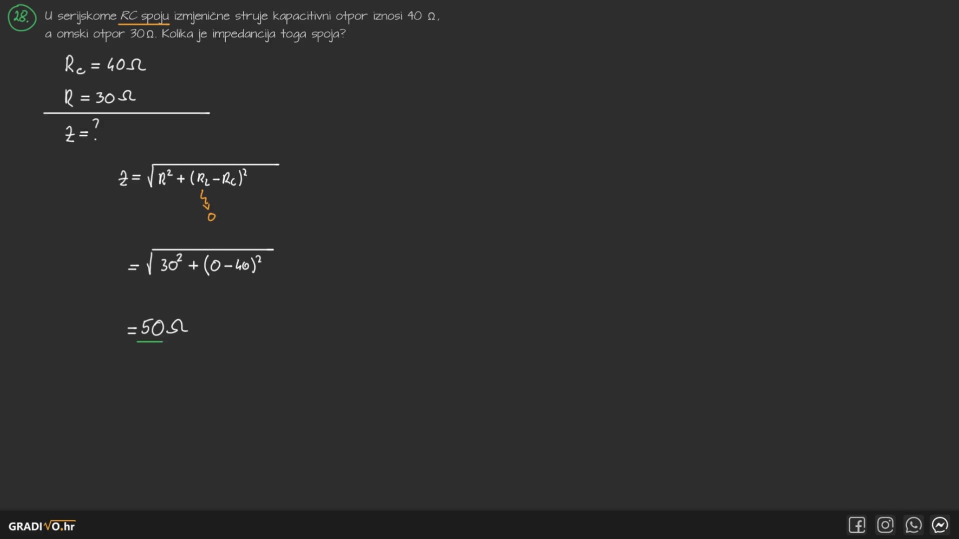U serijskome $R C$ spoju izmjenične struje kapacitivni otpor iznosi $40 \Omega$, a omski otpor $30 \Omega$. Kolika je impedancija toga spoja?