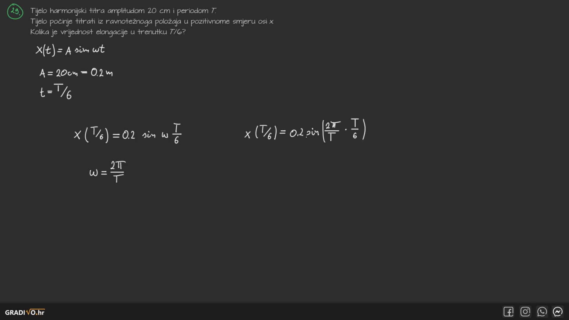 Tijelo harmonijski titra amplitudom 20 cm i periodom $T$. Tijelo počinje titrati iz ravnotežnog položaja u pozitivnome smjeru osi $x$. Kolika je vrijednost elongacije u trenutku $T / 6$ ?