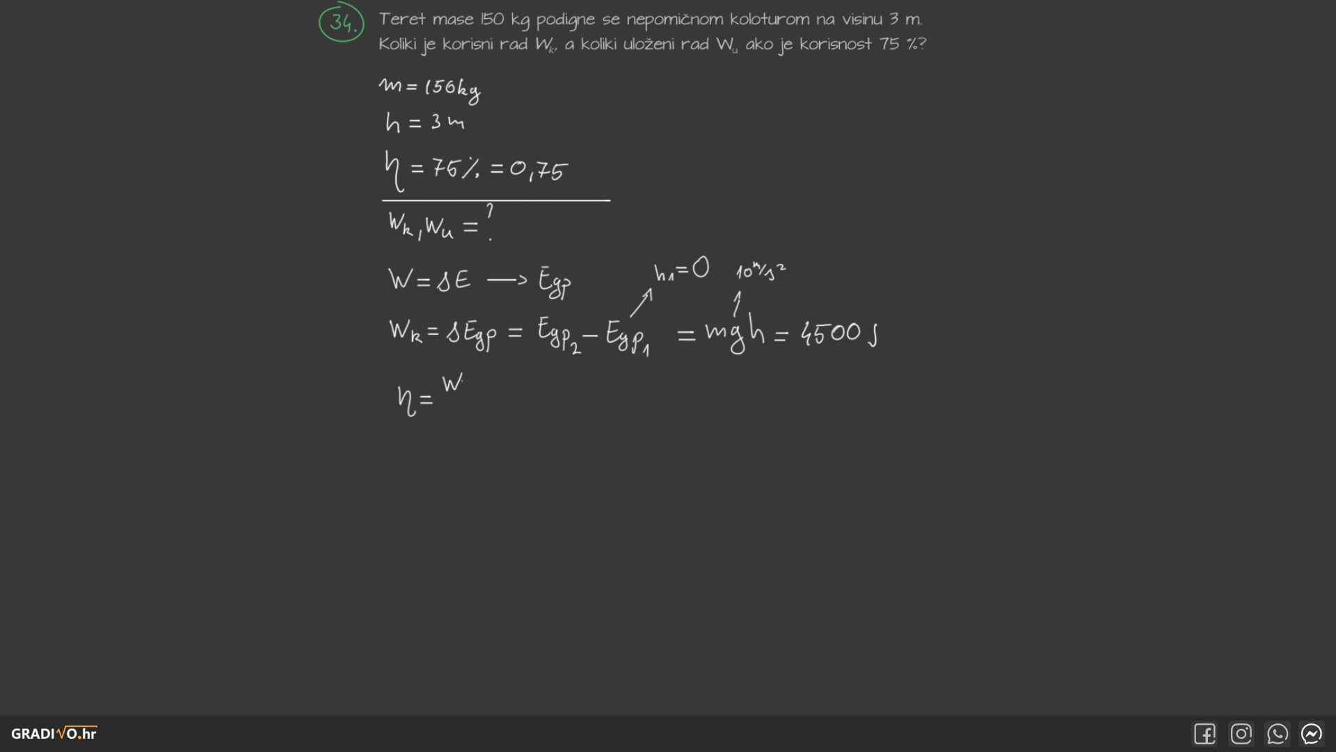 Teret mase 150 kg podigne se nepomičnom koloturom na visinu 3 m . Kolika je korisni rad $W_{\mathrm{k}}$, a koliki uloženi rad $W_{\mathrm{u}}$ ako je korisnost $75 \%$ ?