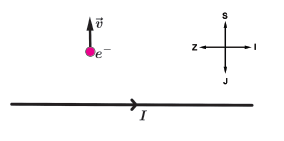 Na slici je prikazan elektron $e^{-}$koji se giba brzinom $\vec{v}$ u blizini ravnoga vodiča kojim prolazi struja $I$. Orijentacija vektora brzine elektrona i smjer struje naznačeni su na slici.