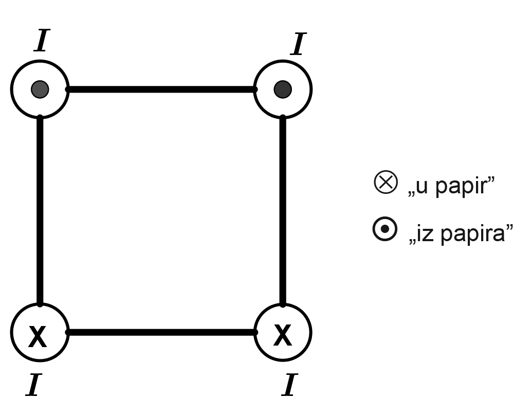 Na slici su prikazana četiri duga paralelna vodiča kroz koje prolaze struje jednake jakosti $I$ u naznačenim smjerovima. Vodiči se nalaze u vrhovima kvadrata.