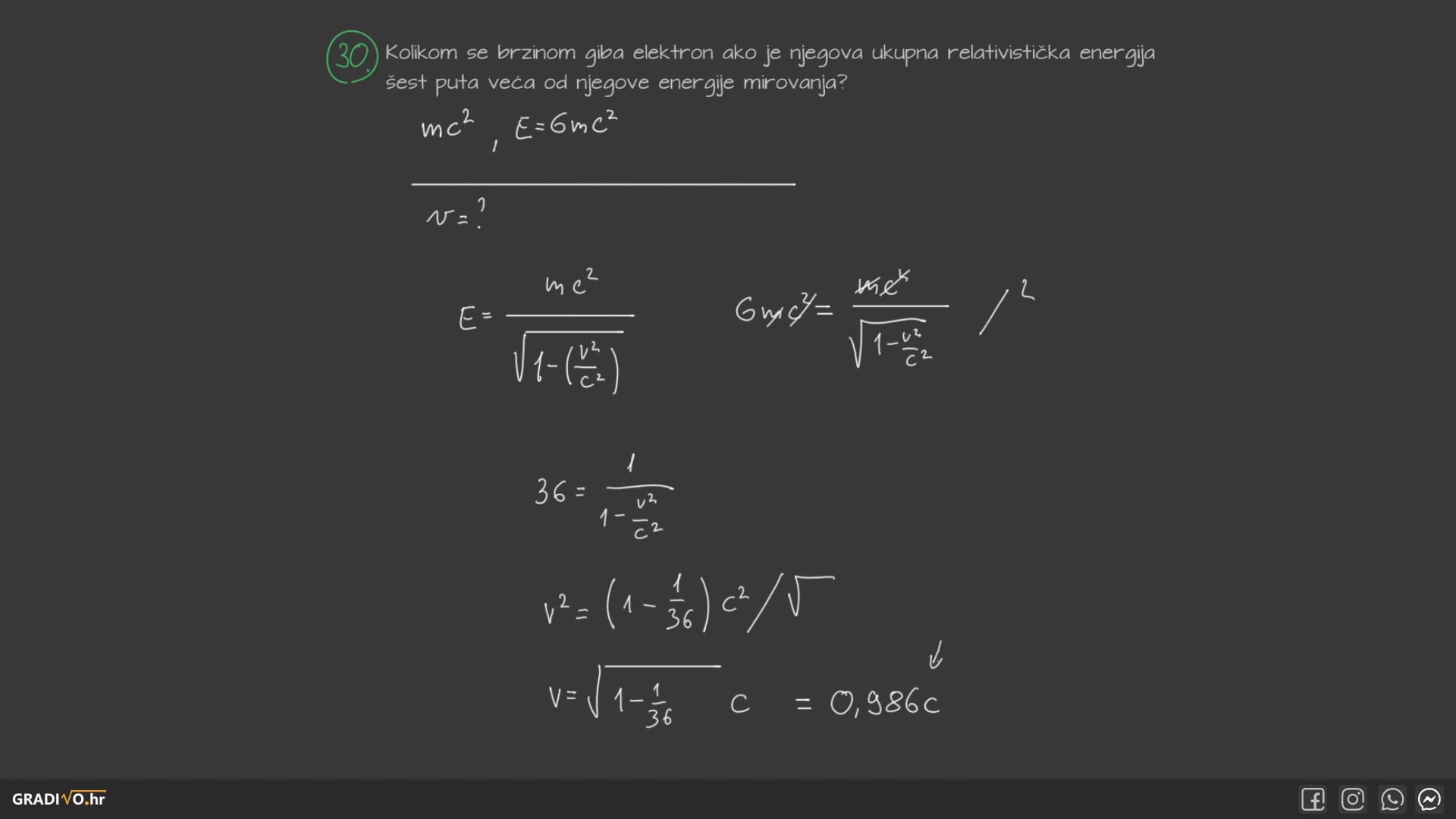 Kolikom se brzinom giba elektron ako je njegova ukupna relativistička energija šest puta veća od njegove energije mirovanja?
