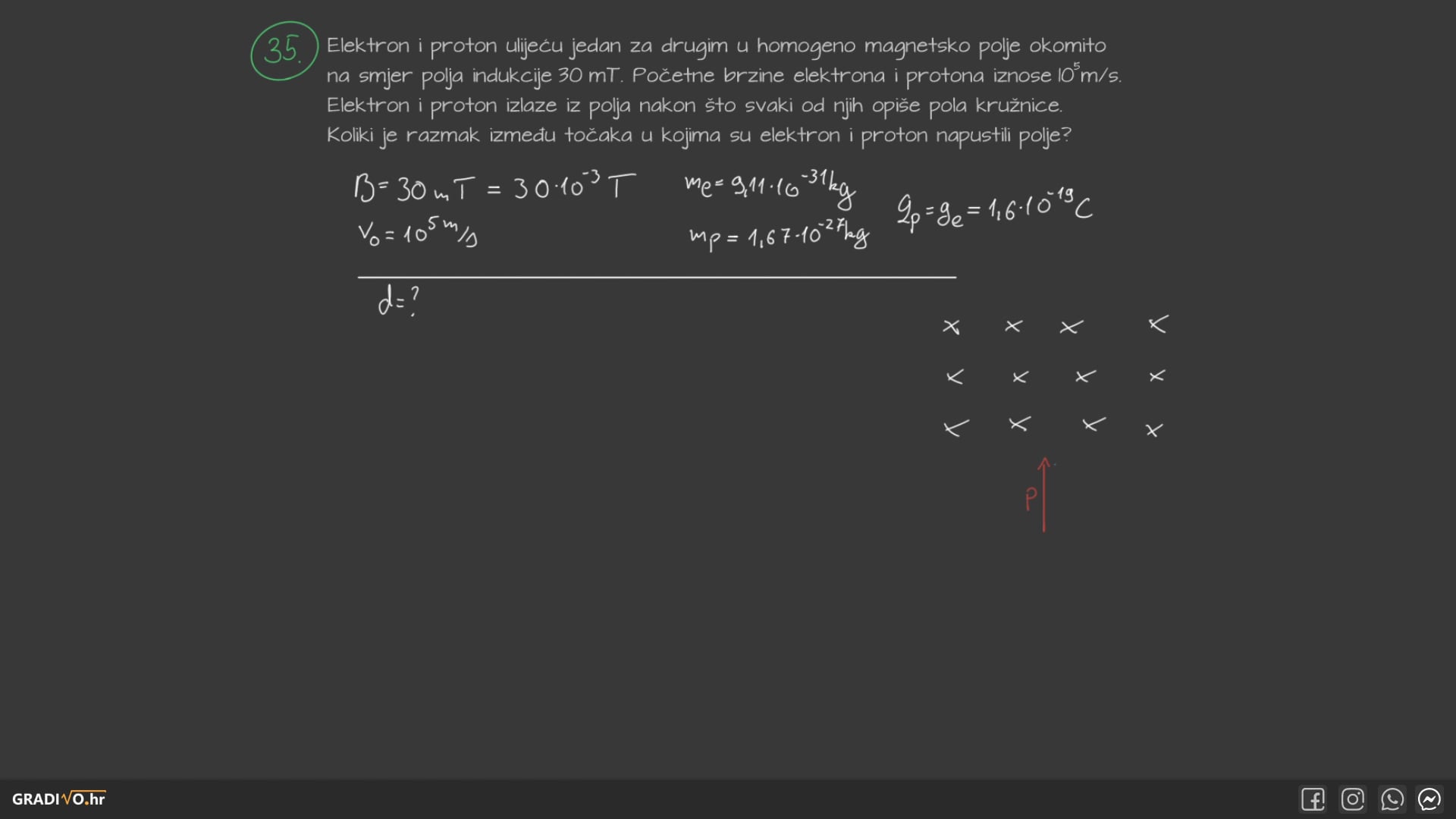 Elektron i proton ulijeću jedan za drugim u homogeno magnetsko polje okomito na smjer polja indukcije 30 mT . Početne brzine elektrona i protona iznose $10^{5} \mathrm{~m} / \mathrm{s}$. Elektron i proton izlaze iz polja nakon što svaki od njīh opiše pola kruźnice. Koliki je razmak između točaka u kojima su elektron i proton napustili polje?