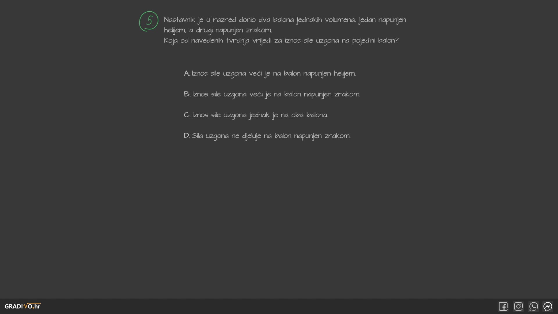 Nastavnik je u razred donio dva balona jednakih volumena, jedan napunjen helijem, a drugi napunjen zrakom. Koja od navedenih tvrdnja vrijedi za iznos sile uzgona na pojedini balon?