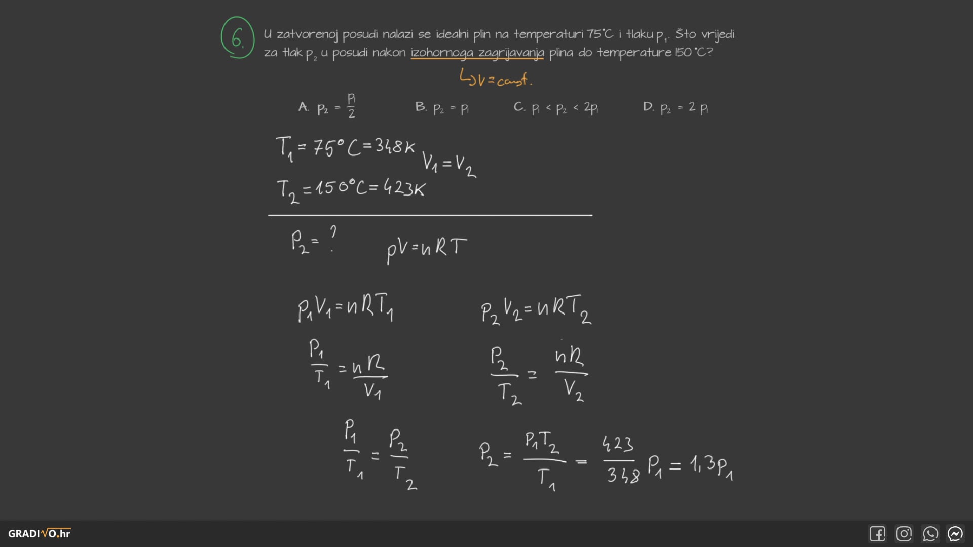 U zatvorenoj posudi nalazi se idealni plin na temperaturi $75^{\circ} \mathrm{C}$ i tlaku $p_{1}$. Što vrijediza tlak $p_{2}$ u posudi nakon izohornoga zagrijavanja plina do temperature $150^{\circ} \mathrm{C}$ ?