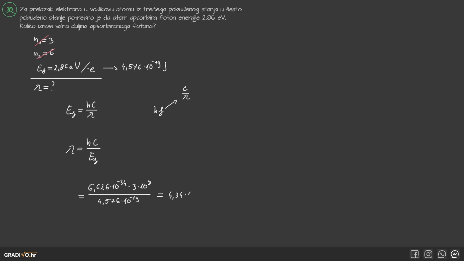 Za prelazak elektrona u vodikovu atomu iz trećeg pobuđenog stanja u šesto pobuđeno stanje potrebno je da atom apsorbira foton energije $2,86 \mathrm{eV}$. Koliko iznosi valna duljina apsorbiranoga fotona?