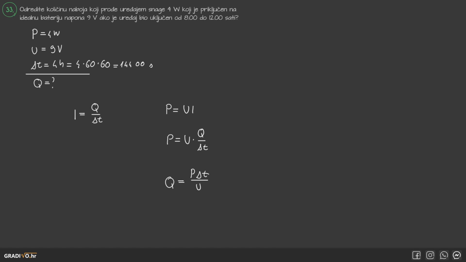 Odredite količinu naboja koji prođe uređajem snage 4 W koji je priključen na idealnu bateriju napona 9 V ako je uređaj bio uključen od 8.00 do 12.00 sati?