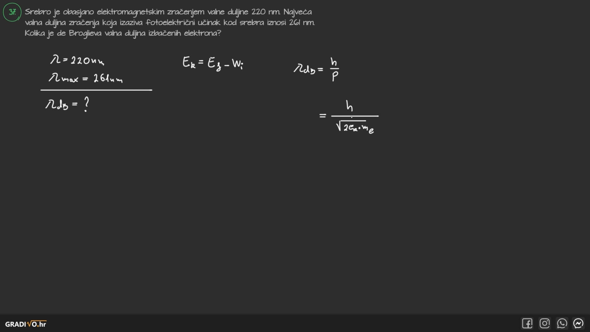 Srebro je obasjano elektromagnetskim zračenjem valne duljine 220 nm . Najveća valna duljina zračenja koja izaziva fotoelektrični učinak kod srebra iznosi 261 nm . Kolika je de Broglieva valna duljina izbačenih elektrona?