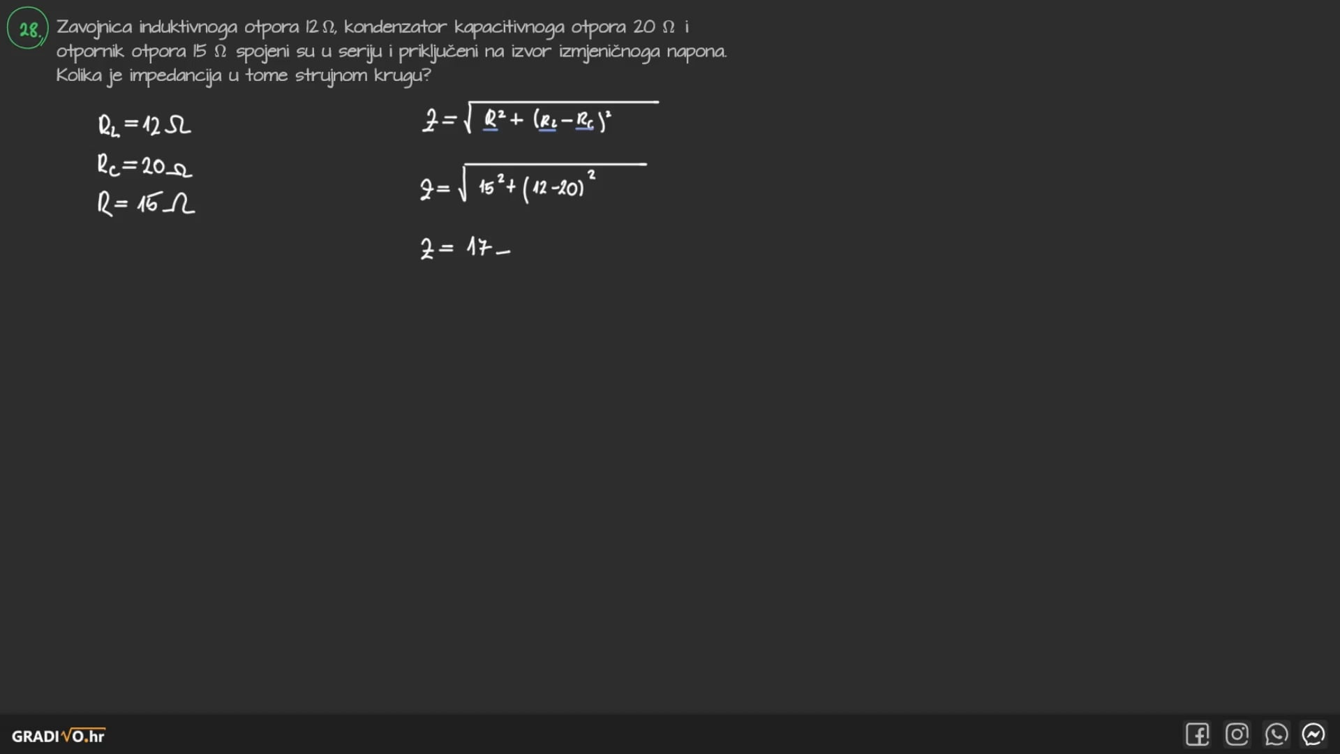 Zavojnica induktivnoga otpora $12 \Omega$, kondenzator kapacitivnoga otpora $20 \Omega$ i otpornik otpora $15 \Omega$ spojeni su u seriju i priključeni na izvor izmjeničnoga napona. Kolika je impedancija u tome strujnom krugu?