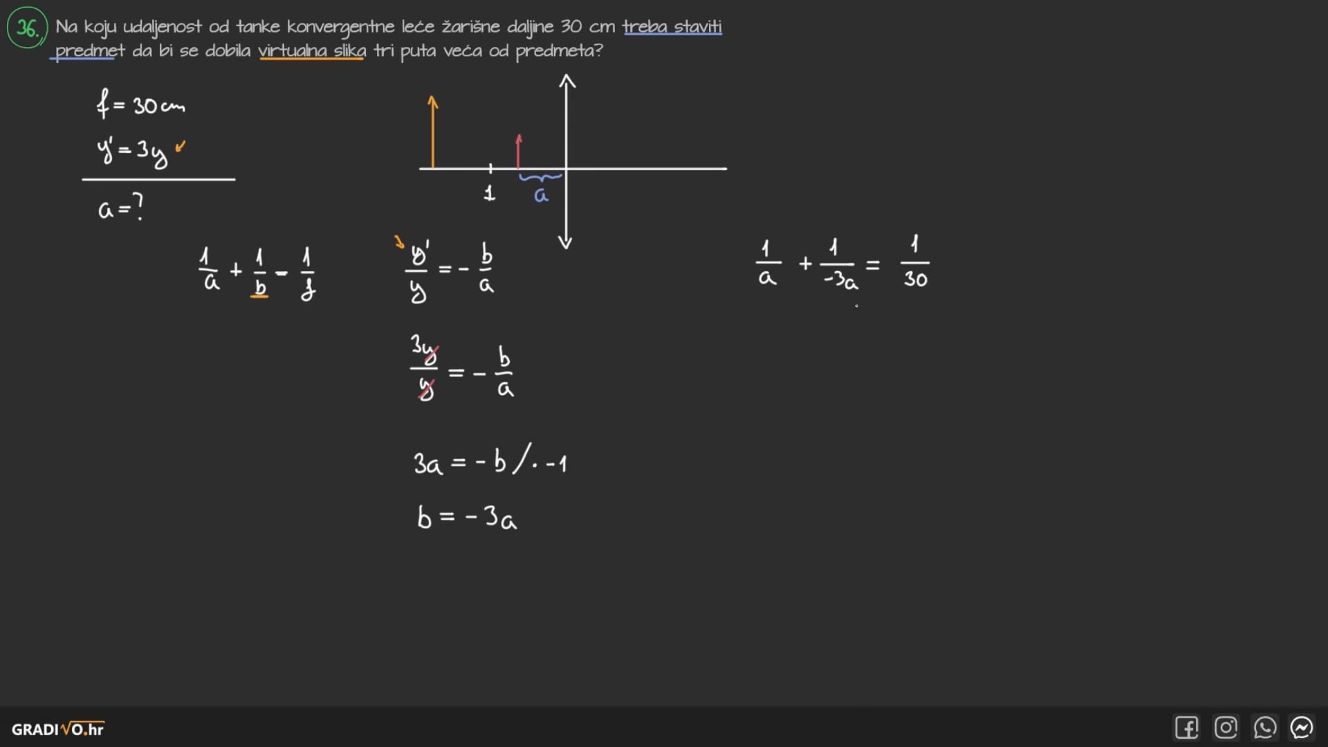Na koju udaljenost od tanke konvergentne leće žarišne daljine 30 cm treba staviti predmet da bi se dobila virtualna slika tri puta veća od predmeta?
