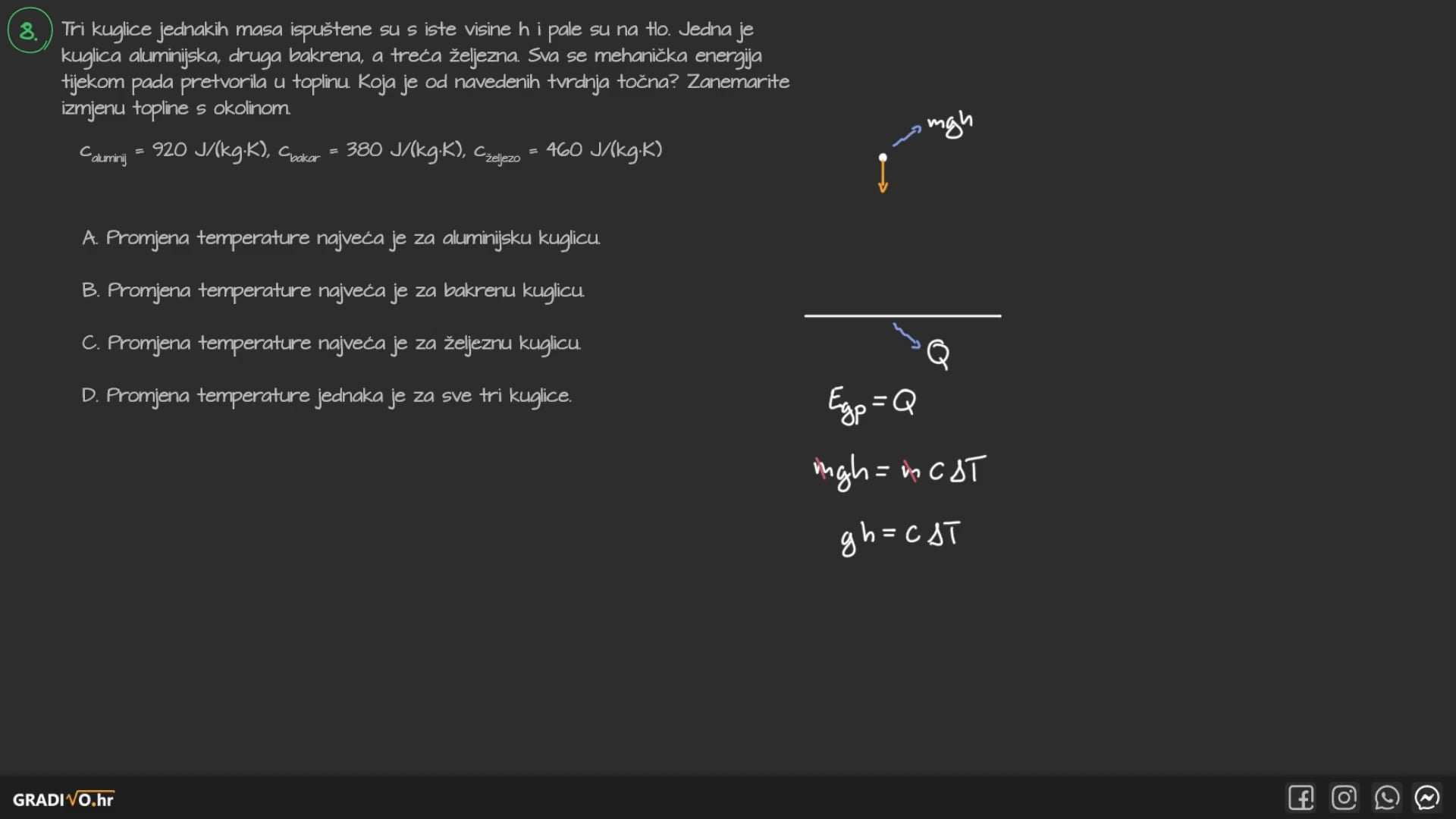 Tri kuglice jednakih masa ispuštene su s iste visine $h$ i pale su na tlo. Jedna je kuglica aluminijska, druga bakrena, a treća željezna. Sva se mehanička energija tijekom pada pretvorila u toplinu. Koja je od navedenih tvrdnja točna? Zanemarite izmjenu topline s okolinom.