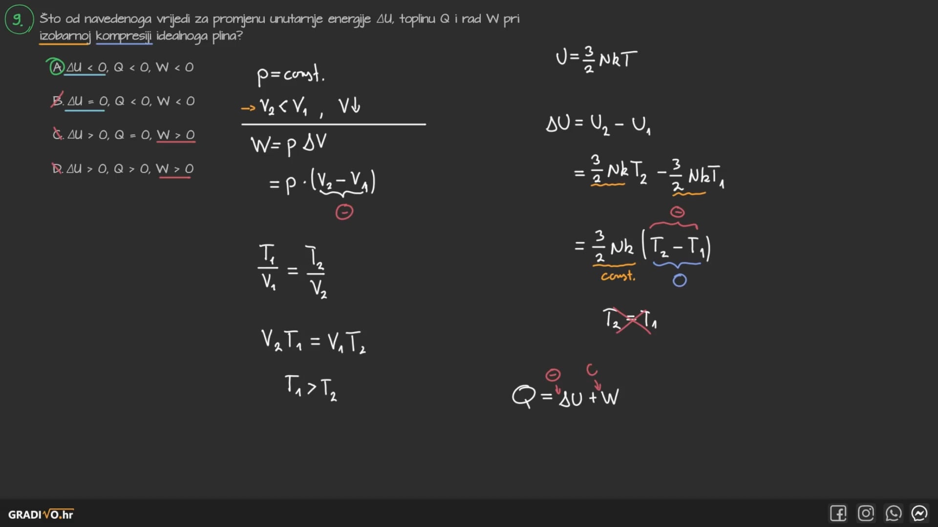 B. \(\Delta U=0, Q<0, W<0\)