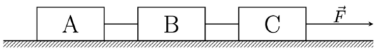 Tri tijela, A, B i C, jednakih masa $m$ na horizontalnoj podlozi povezana su nerastezljivim nitima zanemarivih masa kao što je prikazano na slici. Tijelo $\mathbf{C}$ povlači se stalnom silom $F$ koja sva tri tijela jednoliko ubrzava. Trenje između svih tijela i podloge je zanemarivo.