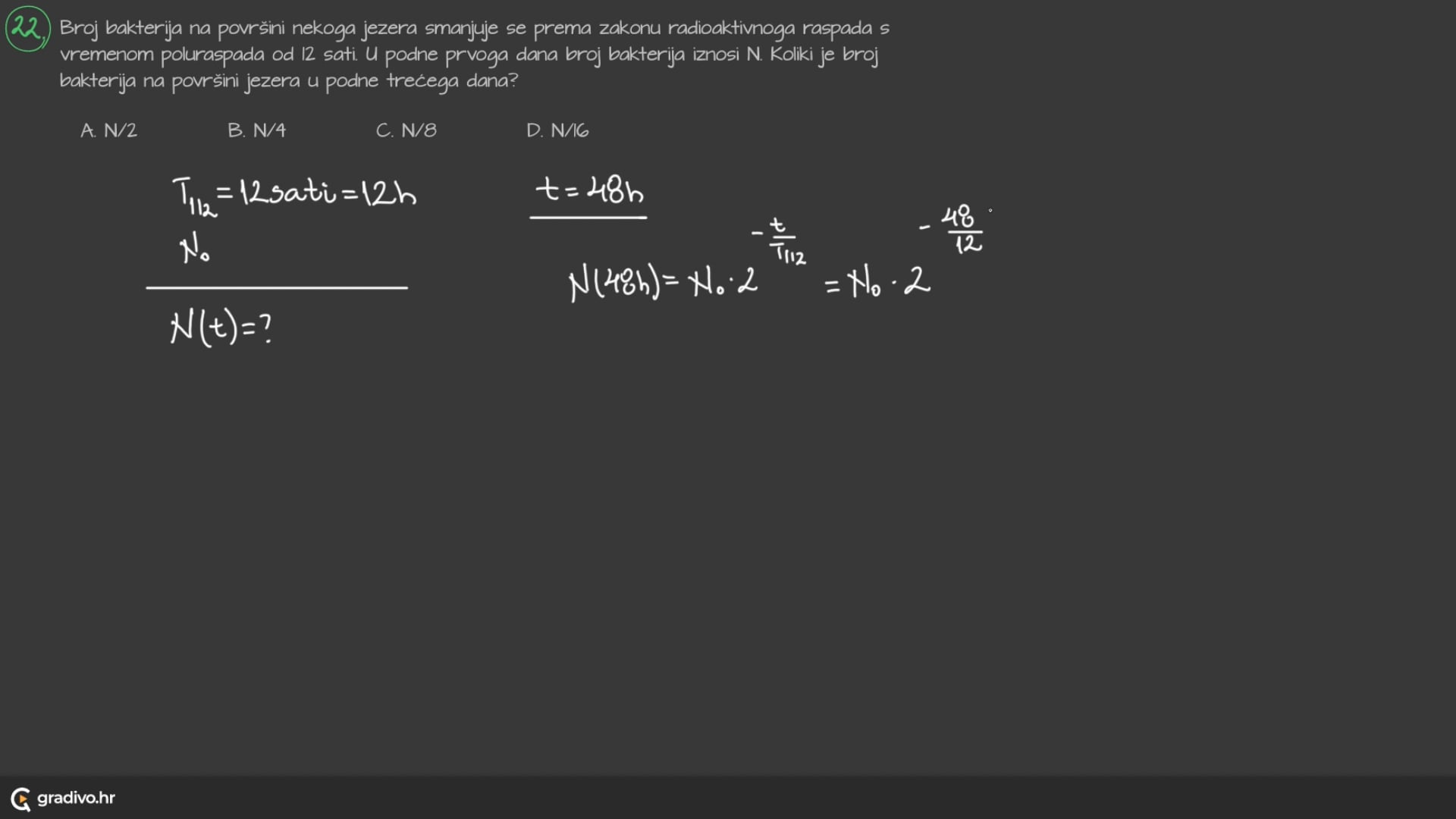 Broj bakterija na površini nekoga jezera smanjuje se prema zakonu radioaktivnoga raspada s vremenom poluraspada od 12 sati. U podne prvoga dana broj bakterija iznosi $N$. Koliki je broj bakterija na površini jezera u podne trećega dana?