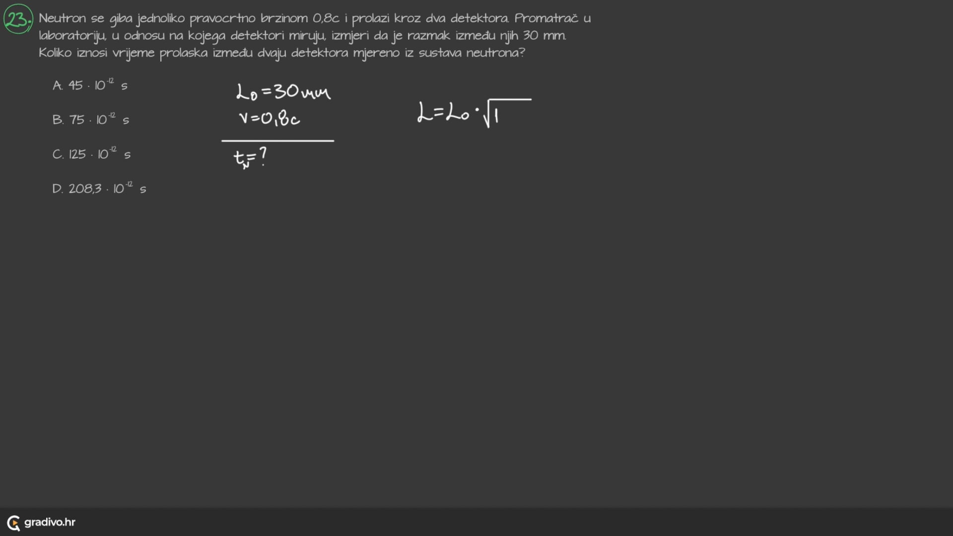 Neutron se giba jednoliko pravocrtno brzinom $0,8 c$ i prolazi kroz dva detektora. Promatrač ulaboratoriju, u odnosu na kojega detektori miruju, izmjeri da je razmak između njih 30 mm . Koliko iznosi vrijeme prolaska između dvaju detektora mjereno iz sustava neutrona?
