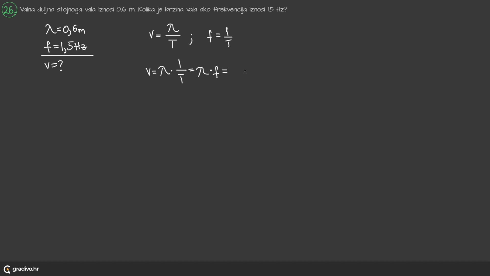 Valna duljina stojnoga vala iznosi $0,6 \mathrm{~m}$. Kolika je brzina vala ako frekvencija iznosi $1,5 \mathrm{~Hz}$ ?