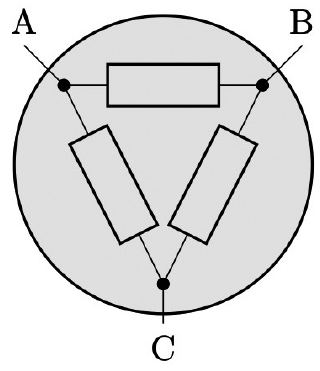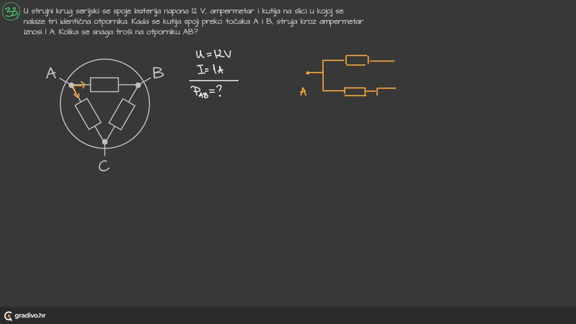 U strujni krug serijski se spoje baterija napona 12 V , ampermetar i kutija na slici u kojoj se nalaze tri identična otpornika. Kada se kutija spoji preko točaka A i B, struja kroz ampermetar iznosi 1 A . Kolika se snaga troši na otporniku $\mathbf{A B}$ ?