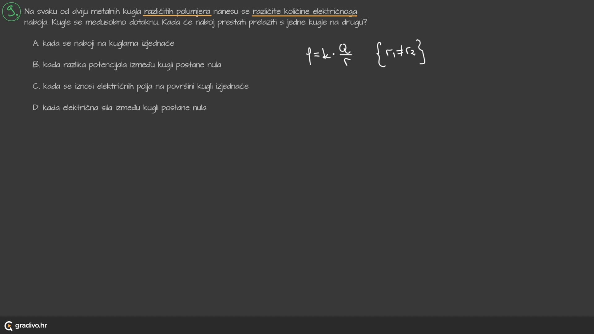 Na svaku od dviju metalnih kugla različitih polumjera nanesu se različite količine električnoga naboja. Kugle se međusobno dotaknu. Kada će naboj prestati prelaziti s jedne kugle na drugu?