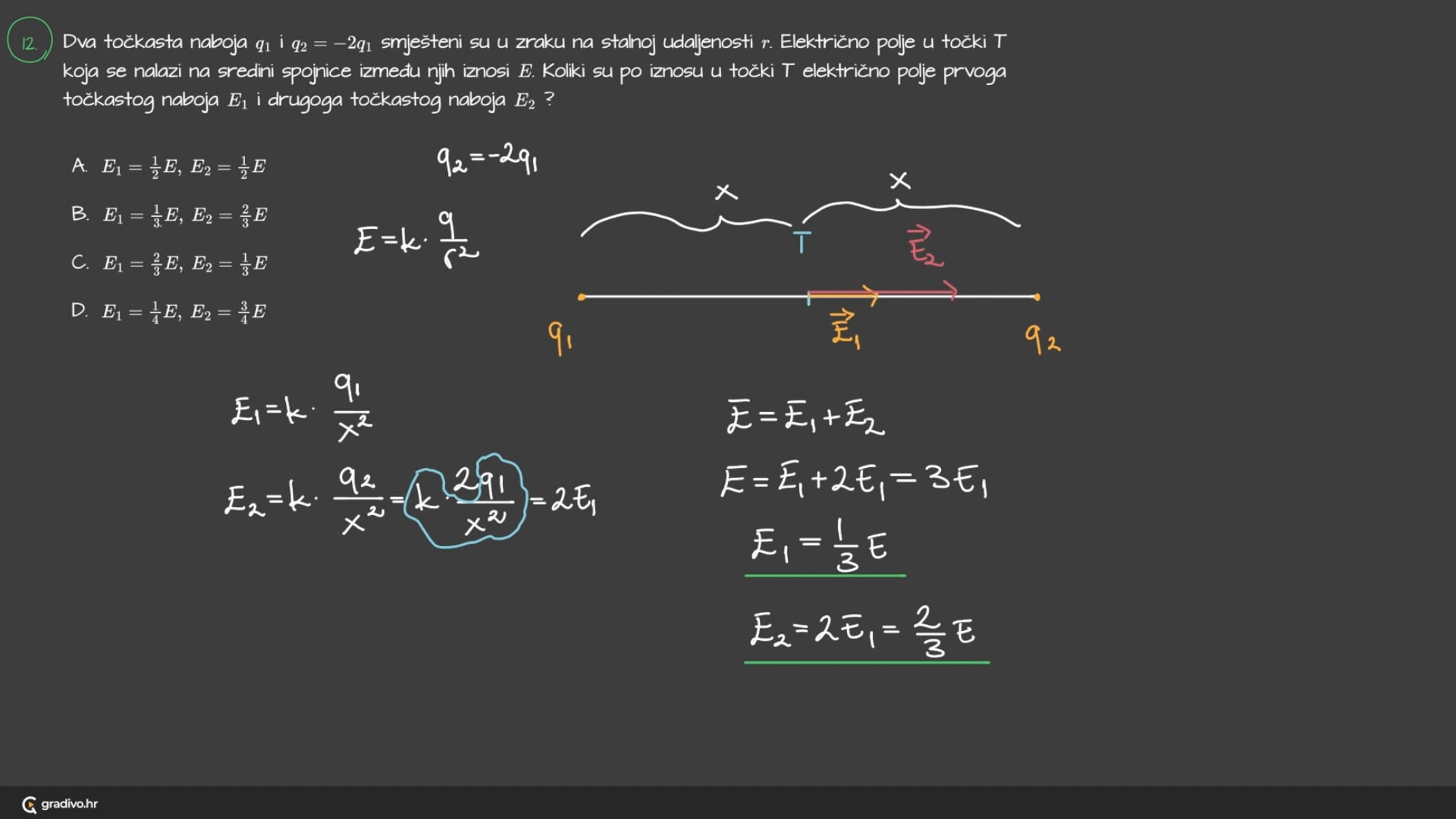 Dva točkasta naboja $q_{1}$ i $q_{2}=-2 q_{1}$ smješteni su u zraku na stalnoj udaljenosti $r$. Električno polje u točki $T$ koja se nalazi na sredini spojnice između njih iznosi $E$. Koliki su po iznosu u točki $T$ električno polje prvoga točkastog naboja $E_{1}$ i drugoga točkastog naboja $E_{2}$ ?