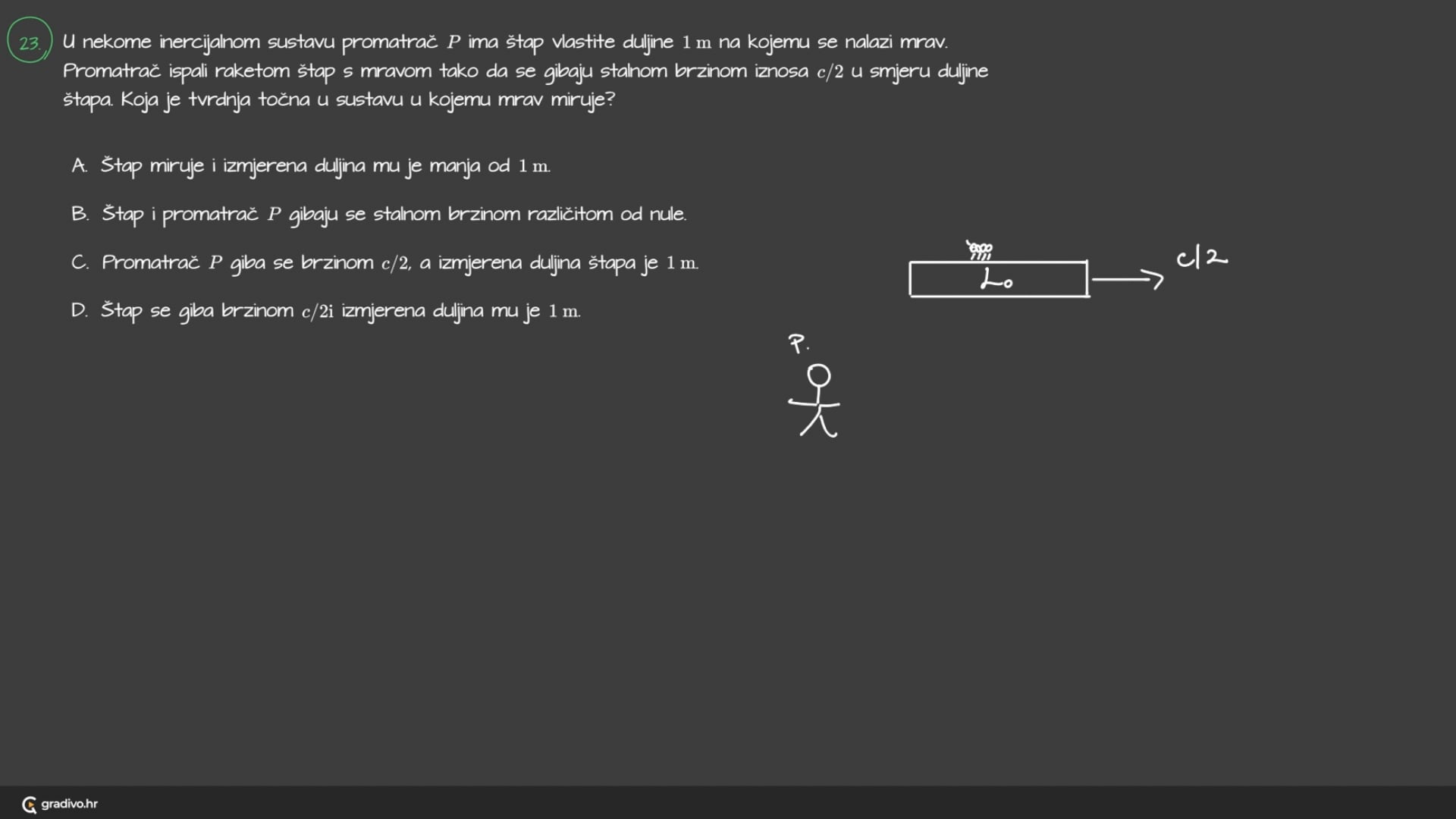 U nekome inercijalnom sustavu promatrač $P$ ima štap vlastite duljine 1 m na kojemu se nalazi mrav. Promatrač ispali raketom štap s mravom tako da se gibaju stalnom brzinom iznosa $c / 2$ u smjeru duljine štapa. Koja je tvrdnja točna u sustavu u kojemu mrav miruje?