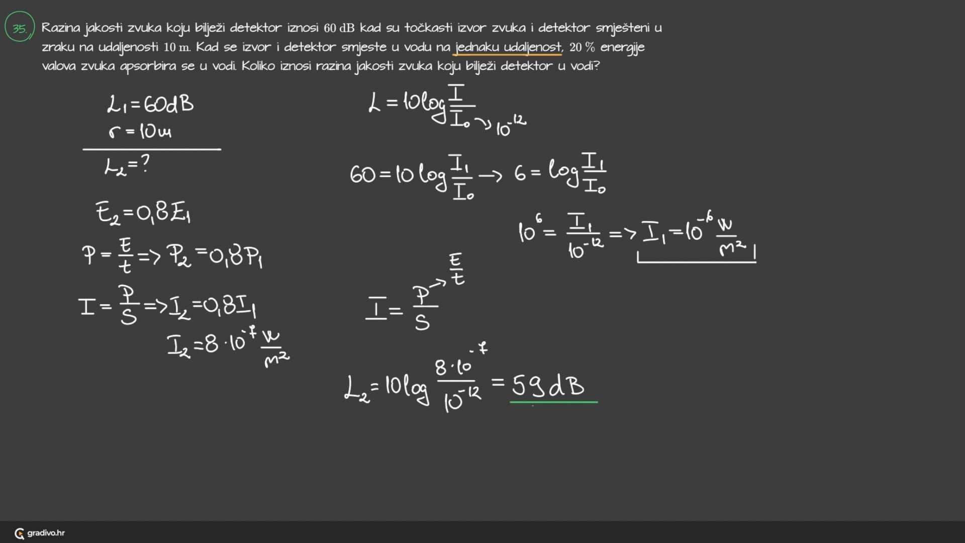Razina jakosti zvuka koju bilježi detektor iznosi 60 dB kad su točkasti izvor zvuka i detektor smješteni u zraku na udaljenosti 10 m . Kad se izvor i detektor smješte u vodu na jednaku udaljenost, 20 % energije valova zvuka apsorbira se u vodi. Koliko iznosi razina jakosti zvuka koju bilježi detektor u vodi?