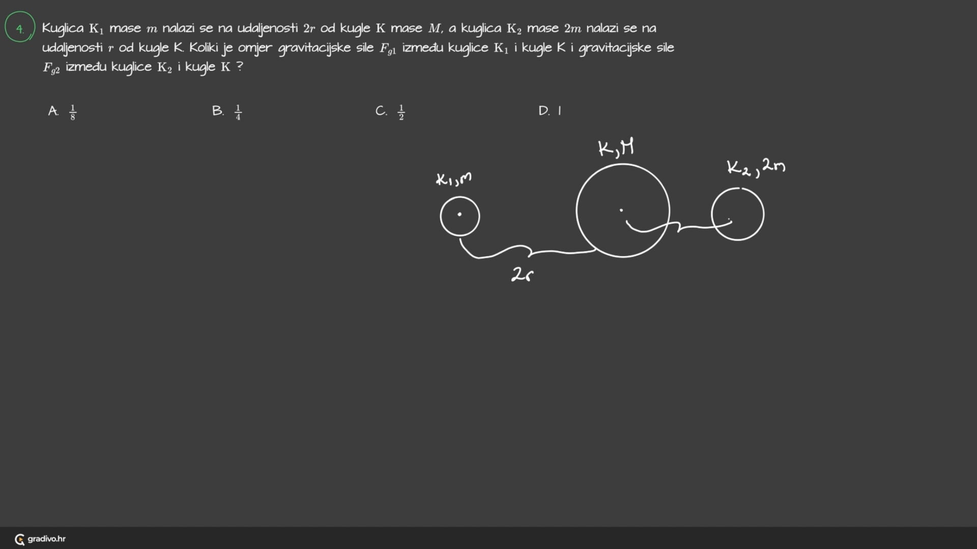 Kuglica $\mathrm{K}_{1}$ mase $m$ nalazi se na udaljenosti $2 r$ od kugle K mase $M$, a kuglica $\mathrm{K}_{2}$ mase $2 m$ nalazi se na udaljenosti $r$ od kugle $K$ . Koliki je omjer gravitacijske sile $F_{\mathrm{g} 1}$ između kuglice $\mathrm{K}_{1}$ i kugle $K$ i gravitacijske sile $F_{\text {g2 }}$ između kuglice $\mathrm{K}_{2}$ i kugle $K$ ?