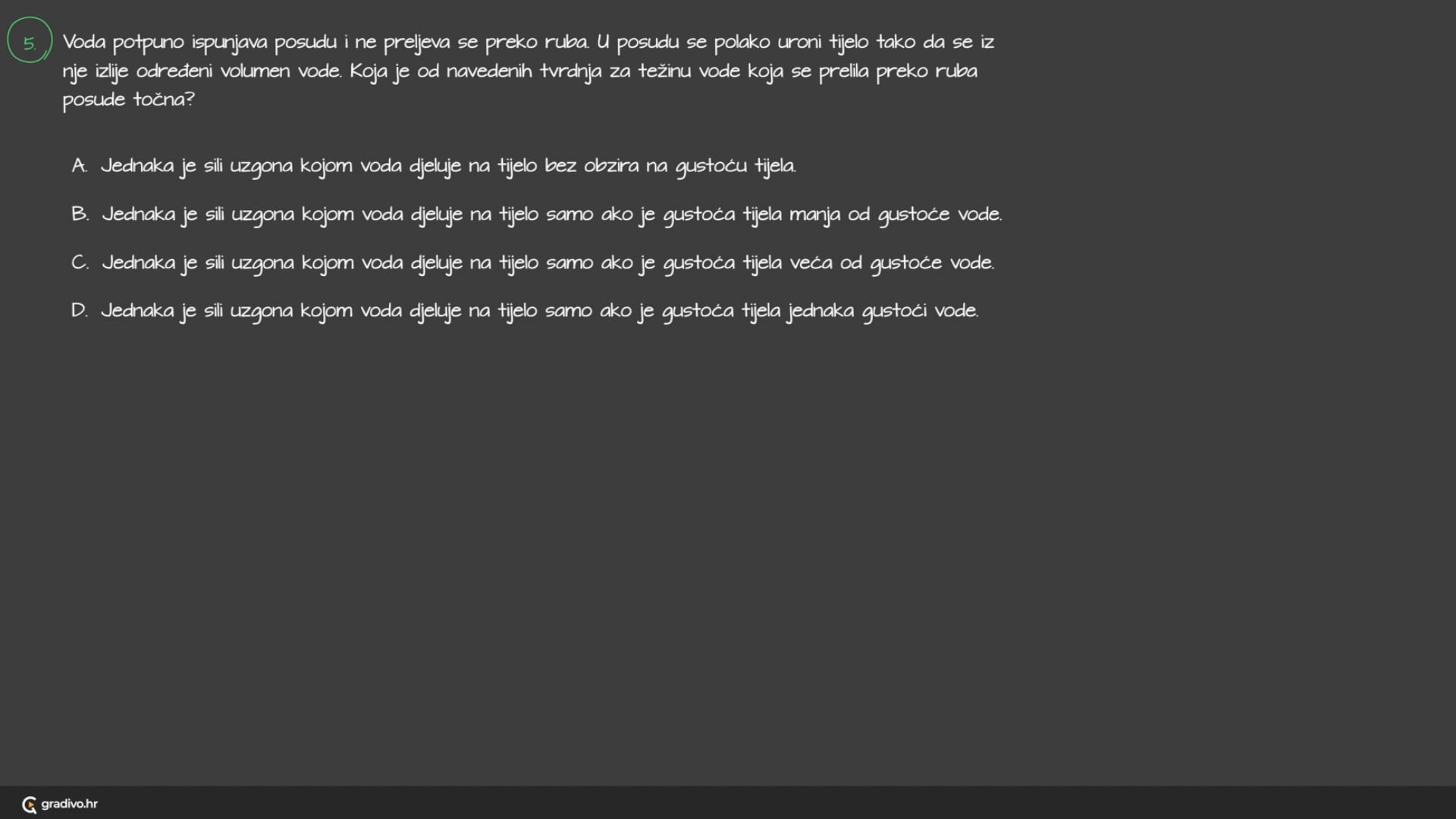 Voda potpuno ispunjava posudu i ne preljeva se preko ruba. U posudu se polako uroni tijelo tako da se iz nje izlije određeni volumen vode. Koja je od navedenih tvrdnja za težinu vode koja se prelila preko ruba posude točna?