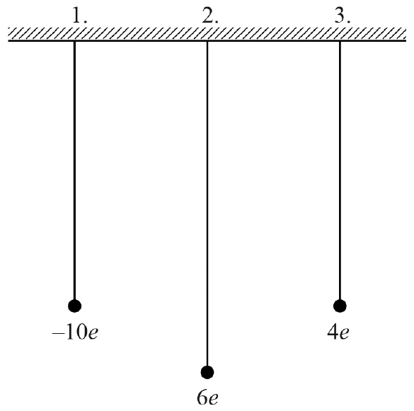 Na slici su prikazane tri jednake metalne kuglice s nabojima $-10 e, 6 e$ i $4 e$ koje vise na tankimnajlonskim nitima. Prvo se međusobno dotaknu prva i druga kuglica i razdvoje se pa se zatimmeđusobno dotaknu druga i treća kuglica i one se razdvoje.