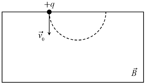 Slika prikazuje pozitivno nabijenu česticu koja ulijeće početnom brzinom $v_{0}$ u prostor u kojemu se nalazi homogeno magnetsko polje $B$. Čestica u polju opiše polukružnicu i zatim ga napuste.