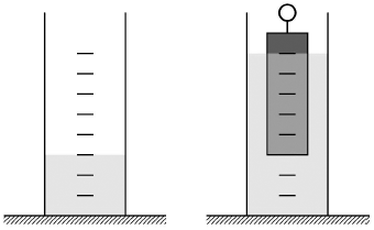 Zatim je uronio tijelo u menzuru s nepoznatom tekućinom tako da pluta kao što je prikazano na slici 2. Uz pomoć menzure izmjerio je volumen uronjenoga dijela tijela.