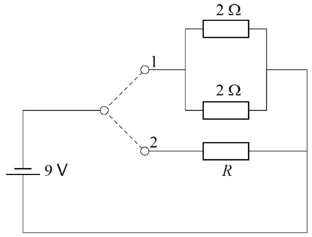 Slika prikazuje strujni krug koji se sastoji od idealne baterije napona 9 V , dva otpornika otpora $2 \Omega$, otpornika nepoznatoga otpora $R$ i sklopke.