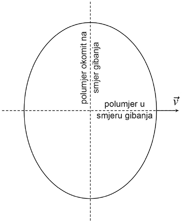 Slika prikazuje tijelo koje u mirovanju ima oblik kugle i giba se pored Zemlje stalnom relativističkom brzinom. Opažači na Zemlji mjere polumjere tijela u smjeru gibanja i okomito na smjer gibanja kao što je prikazano na slici.