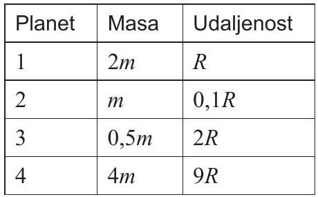 Četiri planeta, $1,2,3$ i 4 , kruže oko iste zvijezde. Podatci o masama planeta i njihovim udaljenostima od zvijezde prikazani su u tablici. Na koji od tih planeta zvijezda djeluje najvećom gravitacijskom silom?