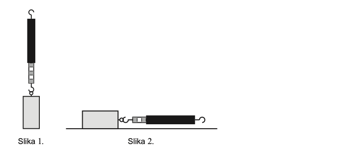 Učenici su dobili zadatak odrediti faktor trenja između utega i podloge koristeći se dinamometrom. Na slici 1. prikazan je uteg ovješen na dinamometar, a na slici 2. prikazan je isti uteg kada se povlači dinamometrom jednoliko po podlozi. Jedan podjeljak na dinamometru odgovara sili od 1 N . Koliko iznosi faktor trenja između utega i podloge?