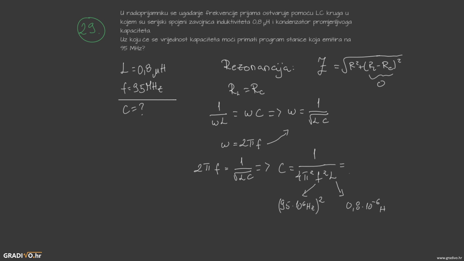 U radioprijamniku se ugađanje frekvencije prijama ostvaruje pomoću LC kruga u kojem su serijski spojeni zavojnica induktiviteta $0,8 \mu \mathrm{H}$ i kondenzator promjenljivoga kapaciteta. Uz koju će se vrijednost kapaciteta moći primati program stanice koja emitira na 95 MHz?