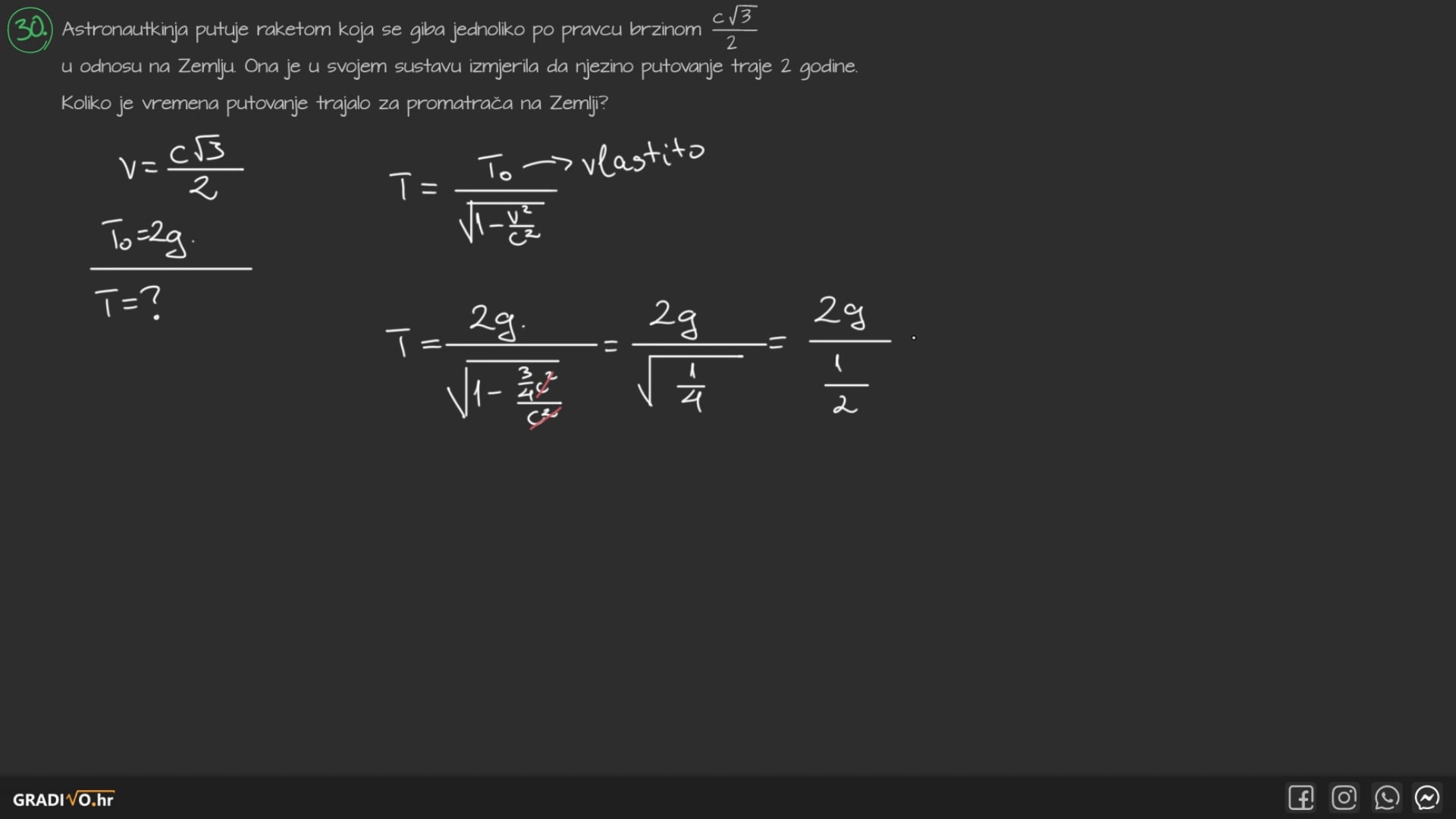Astronautkinja putuje raketom koja se giba jednoliko po pravcu brzinom $\frac{c \sqrt{3}}{2}$ u odnosu n Zemlju. Ona je u svojem sustavu izmjerila da njezino putovanje traje 2 godine. Koliko je vremena putovanje trajalo za promatrača na Zemlji?