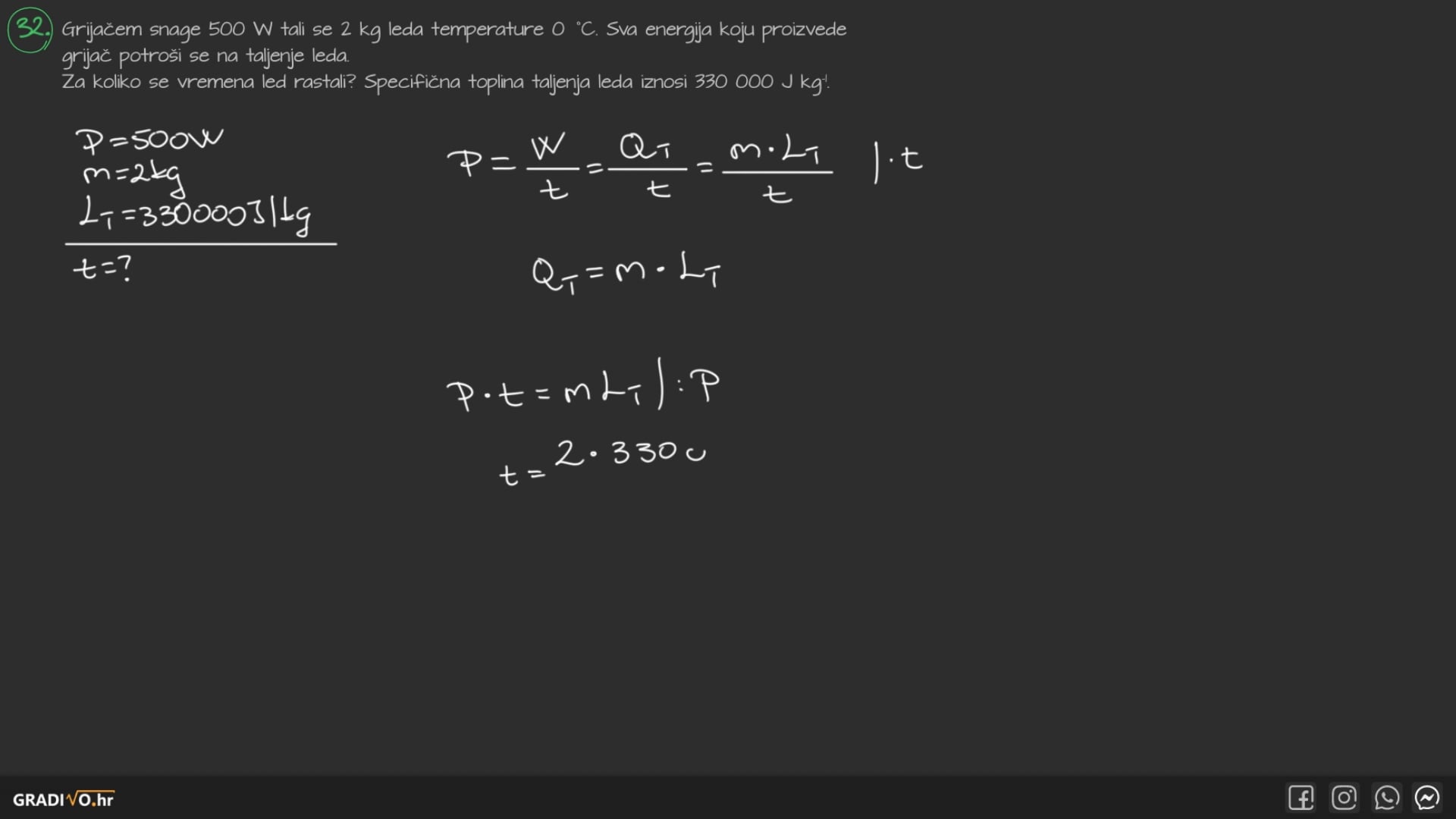 Grijačem snage 500 W tali se 2 kg leda temperature $0^{\circ} \mathrm{C}$ . Sva energija koju proizvede grijač potroši se na taljenje leda.