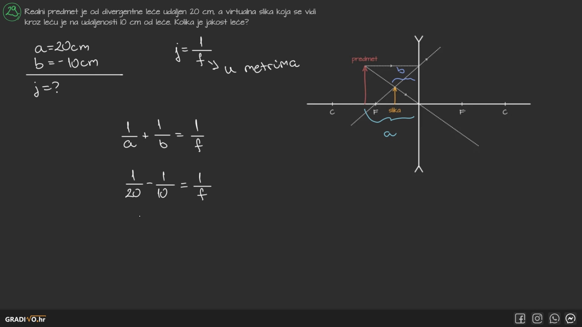 Realni predmet je od divergentne leće udaljen 20 cm , a virtualna slika koja se vidikroz leću je na udaljenosti 10 cm od leće.