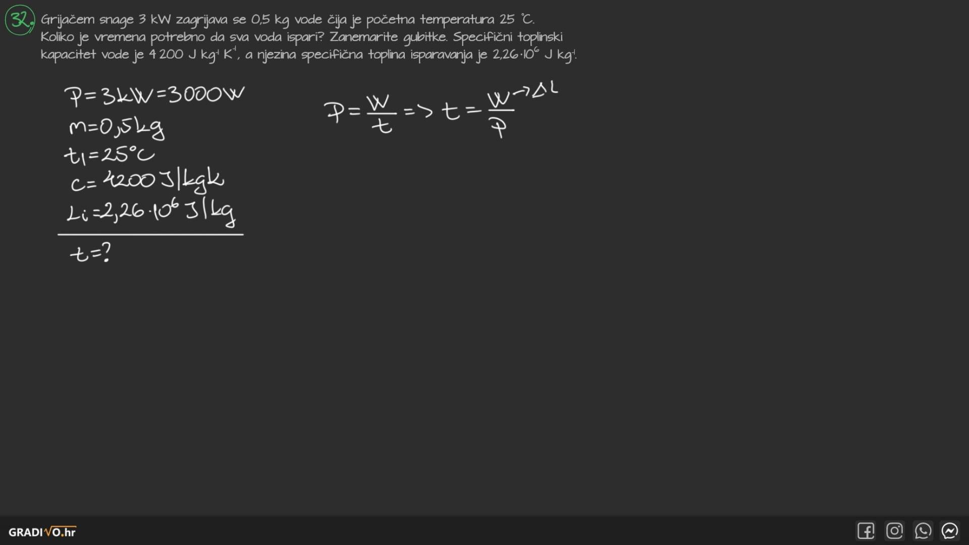 Grijačem snage 3 kW zagrijava se $0,5 \mathrm{~kg}$ vode čija je početna temperatura $25^{\circ} \mathrm{C}$. Koliko je vremena potrebno da sva voda ispari? Zanemarite gubitke. Specifični toplinski kapacitet vode je $4200 \mathrm{~J} \mathrm{~kg}^{-1} \mathrm{~K}^{-1}$, a njezina specifična toplina isparavanja je $2,26 \cdot 10^{6} \mathrm{~J} \mathrm{~kg}^{-1}$.