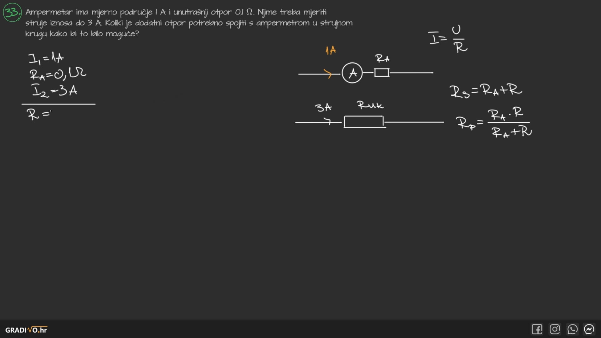Ampermetar ima mjerno područje 1 A i unutrašnji otpor $0,1 \Omega$. Njime treba mjeriti struje iznosa do 3 A.
