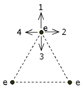 Tri elektrona razmještena su tako da zatvaraju jednakostraničan trokut, kao što je prikazano na crtežu. Koja strjelica označava vektor rezultantne elektrostatske sile na elektron u gornjem vrhu trokuta?
